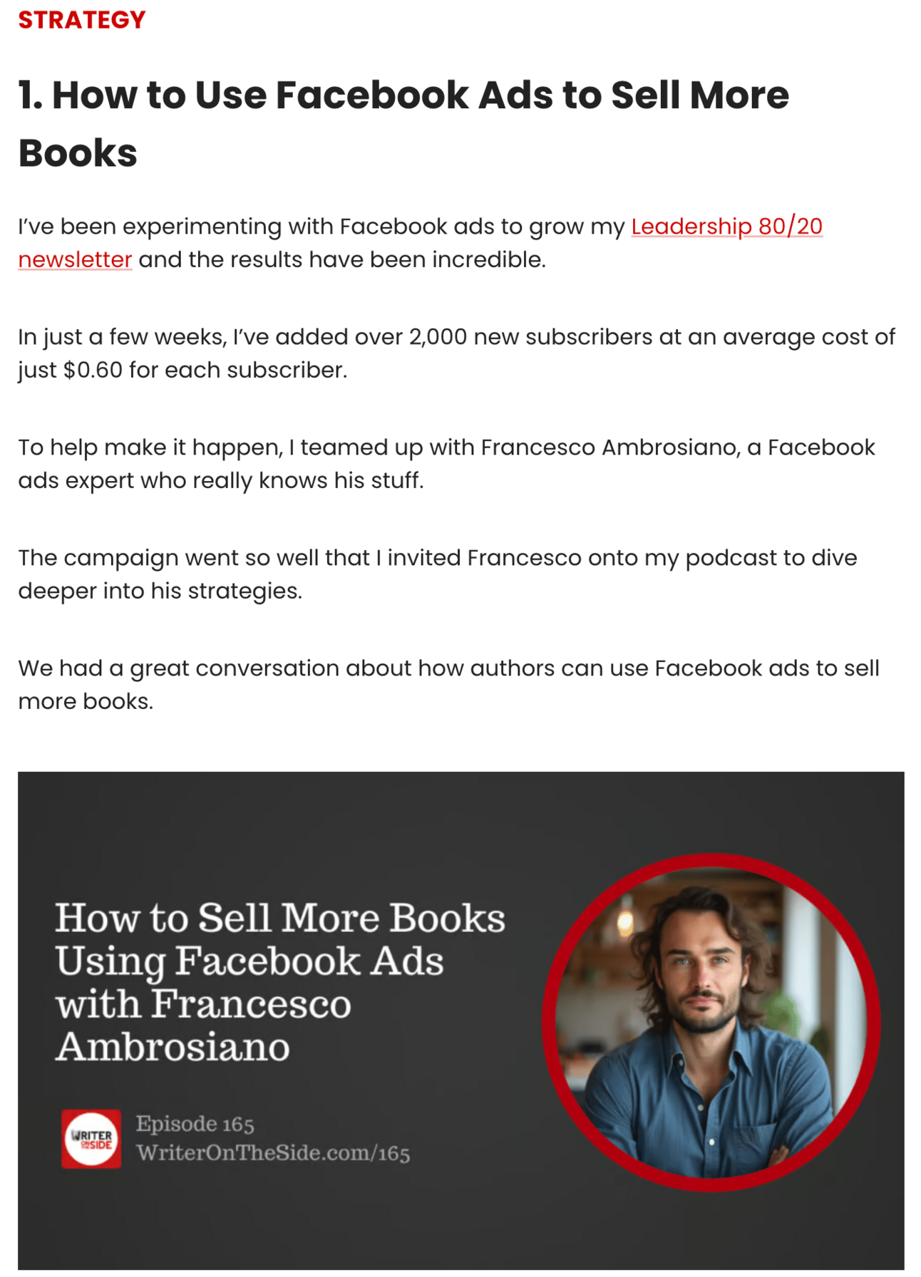 I was recently a guest in Hassan’s podcast “Writer’s on the side” https://www.writerontheside.com/selling-books-using-facebook-ads-with-francesco-ambrosiano/. He even featured me in one of his newsletters. There’s definitely a lot of curiosity and interest around growing a newsletter through ads—and I’m now working with five different authors on exactly that.