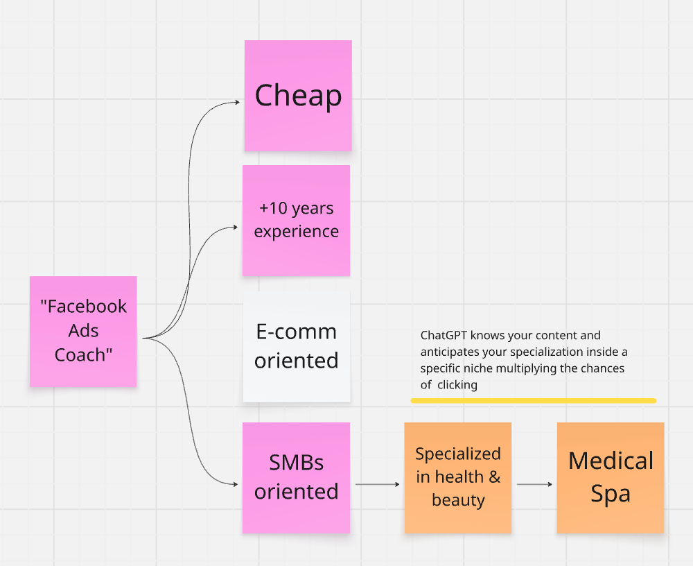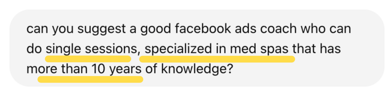 Forget about traditional SEO, or at least don't rely on it alone. What matters now is understanding how the user and machine interact today. It's a conversation, often with multiple layers of depth. A user might start with a simple request, like finding a “Facebook Ads coach”, but quickly add more context and refine their query in ways that don't fit the structure of a typical search on Google or Bing.